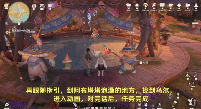 再次跟随指引,去找菇菇王泡澡地方和乌尔集合,走进,进入动画;