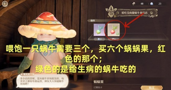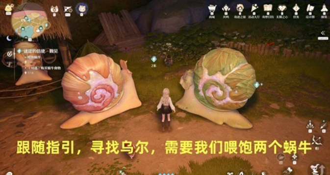 到地方后,需要我们喂饱蜗牛,如果没有蜗牛食物,可以去找曼尤尤购买(也就是爱吃没商量蜗牛食品店处)