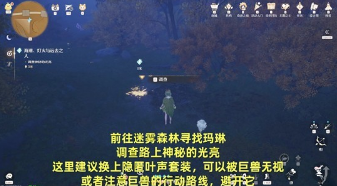 跟随指引,调查森林里神秘的光亮;然后净化掉魔气怪;