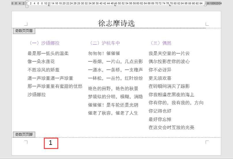 按键盘上的tab键,将鼠标光标定位在页脚第三栏文本页码要显示的位置(与标尺上第三个左对齐制表位对齐),输入域代码{=3*{page}},同时按Shift+F9切换域即可显示第三栏文本的页码“3”。