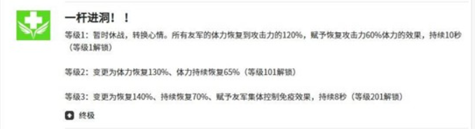 是一个团队防御向的被动技能。在战斗中有概率触发,触发后能提升我方全体队友20%的防御力,在面对高爆发敌人时能为团队争取更多生存空间。该效果在最高品质下,防御力加成可提升至28%。需要注意的是,这个增益效果通常在敌方行动的回合才有机会触发。