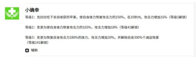 是一个强力的自我恢复与增益技能。克拉拉通过制造并食用一个苹果,为自身恢复基于攻击力150%的体力。不仅如此,在接下来的10秒内,她还能获得16%的攻击力加成,从而提升自身的输出能力。当该技能达到等级三时,使用后还能解除自身身上的减益效果,解除量高达300%,这让她在面对敌方debuff时拥有很强的自保能力。