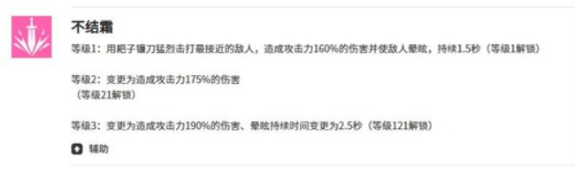 克拉拉的一个兼具输出与控制效果的技能。她会使用镰刀快速攻击距离最近的一名敌人,造成攻击力160%的伤害,并附带持续1.5秒的眩晕效果。这个技能在实战中可以用来打断敌人的关键行动。当技能提升至等级三时,眩晕的持续时间会延长至2.5秒,控制能力更为显著。