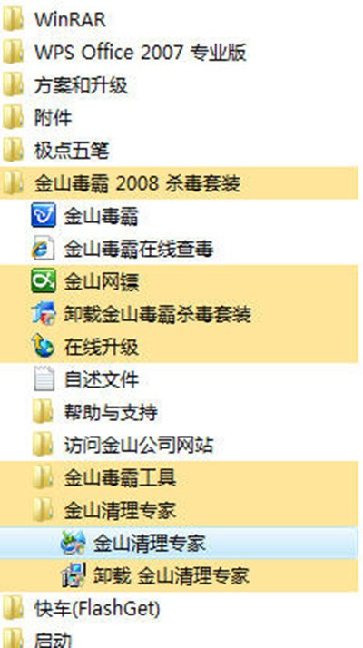 2、从开始菜单程序组→金山毒霸2008杀毒套装(毒霸2009)→金山清理专家,点击金山清理专家的快捷方式运行。