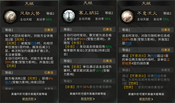 周瑜的天赋【风助火势】,在主动行动时发动,对敌方全体造成伤害并施加【风势】,在大回合结束时还可额外施加一层【风势】。当敌方目标被施加灼烧后,可以给相邻单位施加一层灼烧;消耗【风势】还会为目标施加8%易伤。