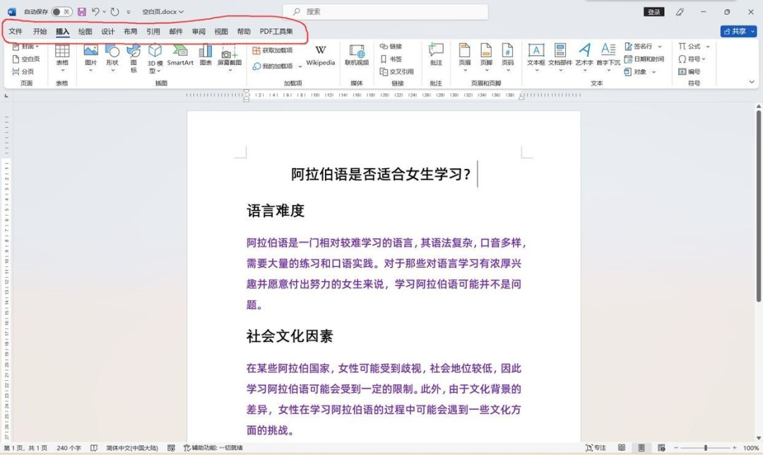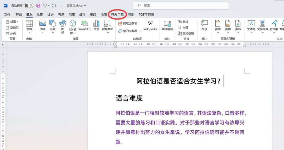 5、返回Word文档,可见【开发工具】选项卡已经在功能区中显示出来了。