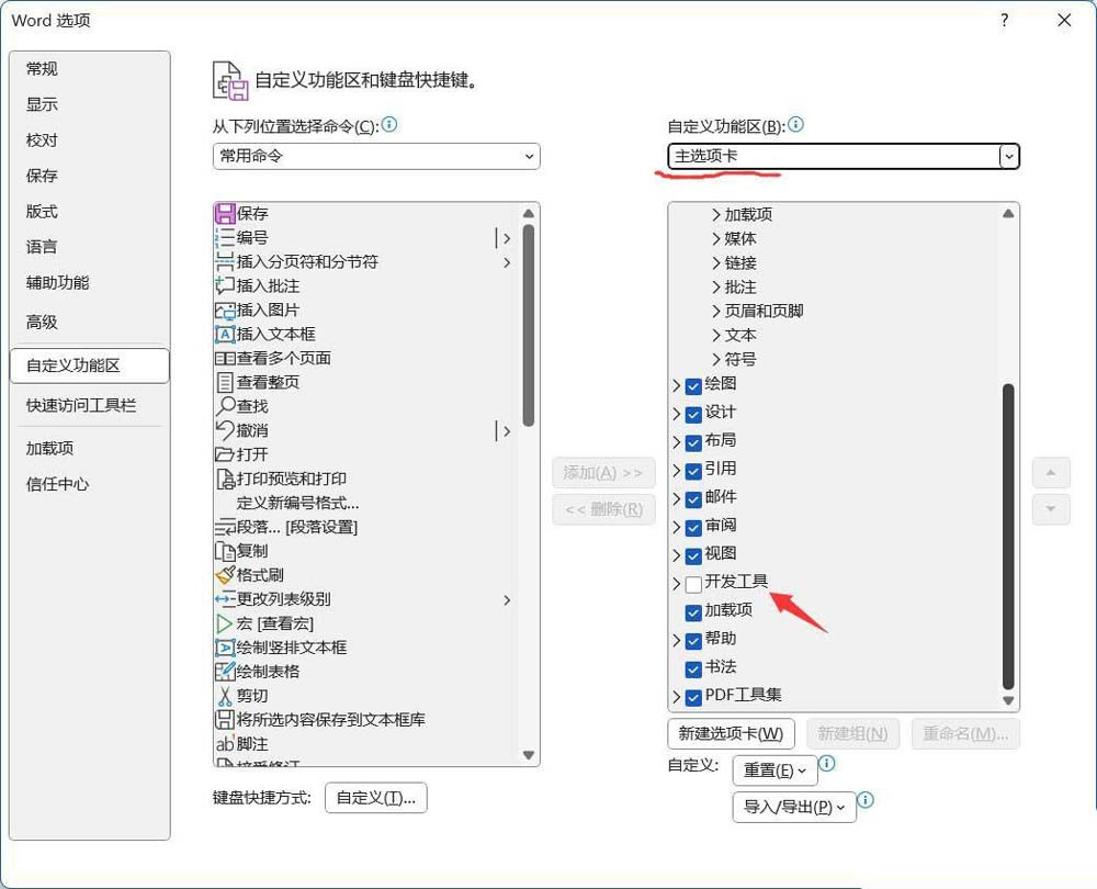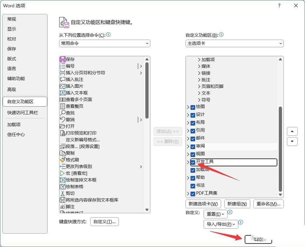4、在右侧的【主选项卡】下方找到【开发工具】,将其勾选,再单击【确定】按钮。