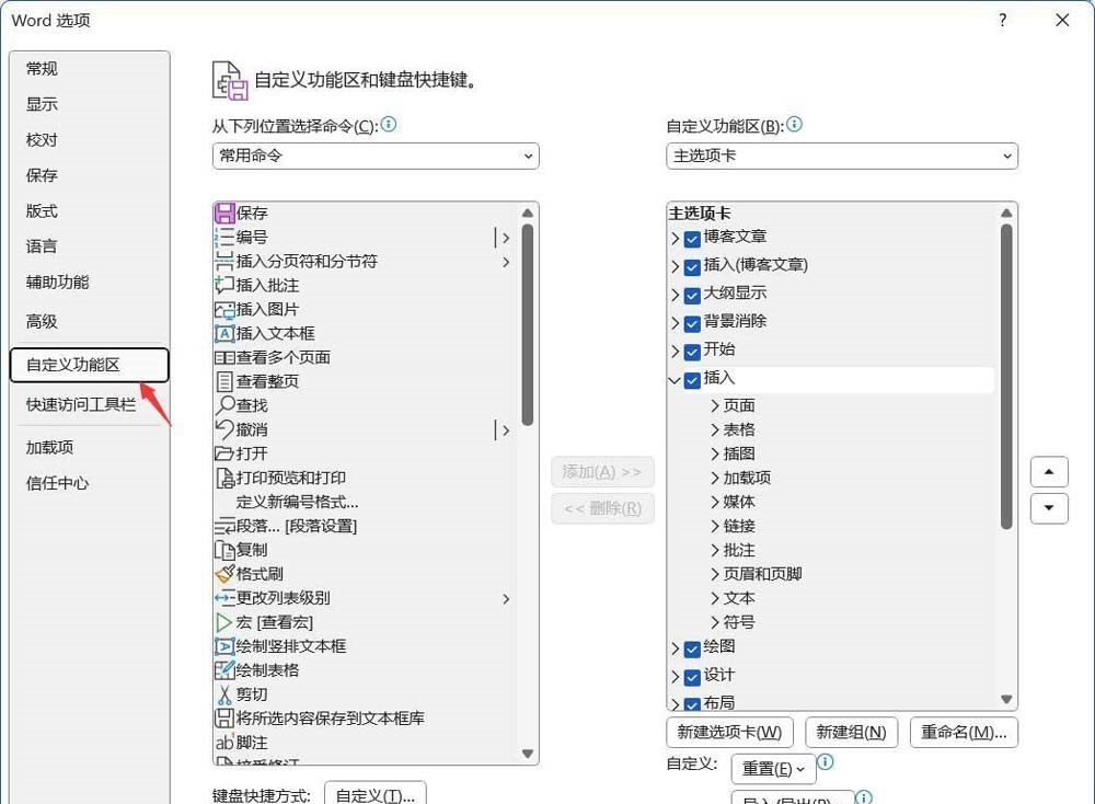 3、在弹出的【Word选项】对话框中,单击【自定义功能区】按钮。