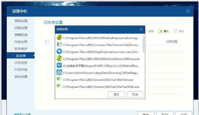4、在弹出的窗口列表中选择想要添加进白名单中的软件,点击"确定"即可。