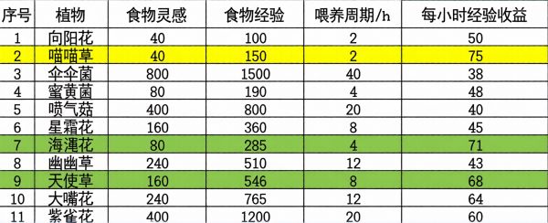 1、虽然喵喵草(标黄)给的经验最高,但是海神花和天使草(标绿)更符合一般玩家的作息。
