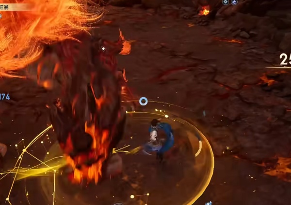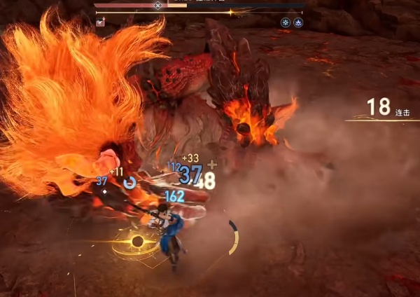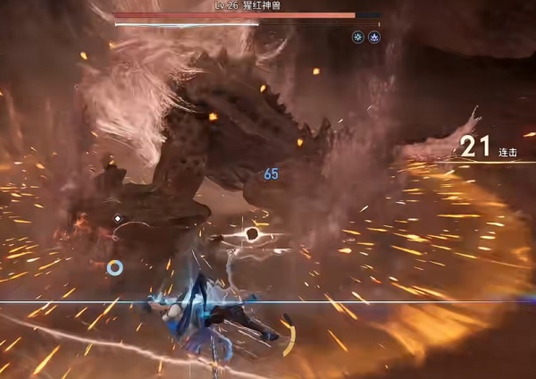 2.然后还需要去了解boss的机制,比如说去打猩红神兽这个boss的时候,其尾部是最脆弱的,所以需要玩家们去该boss的尾部进行攻击,大概攻击几秒的功夫,该boss就会往下攻击释放一道熔浆,这时候就可以直接闪避,会出现明显的闪光状态,该状态是可以提供几秒无敌的,然后再进行反击就能保持无伤,而且连击次数也会一直存在。
