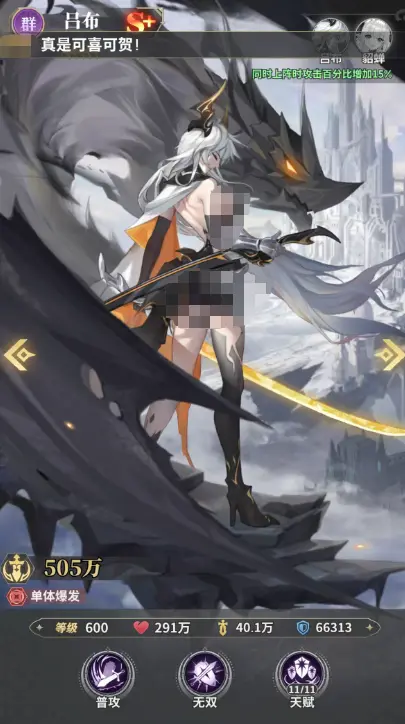 3、吕布担任单点穿透核心,依靠“无双”技能实现高额瞬时爆发。该技能不依赖怒气即可释放,并为全队提供10%基础伤害加成;当叠加至满层时,最高可达成200%攻击增幅。配合其被动机制,能有效缩短关键目标的存活时间,为后续追击链创造理想条件。