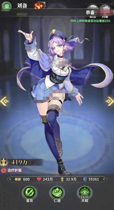 7、刘备提供双重生存保障:其治疗技能可恢复全体友军相当于刘备自身攻击力40%的生命值,并生成等同于其攻击力100%的护盾。此外,该护盾还附带10%免伤效果,显著延长前排承伤时间,确保追击链在持久战中不因减员而中断。