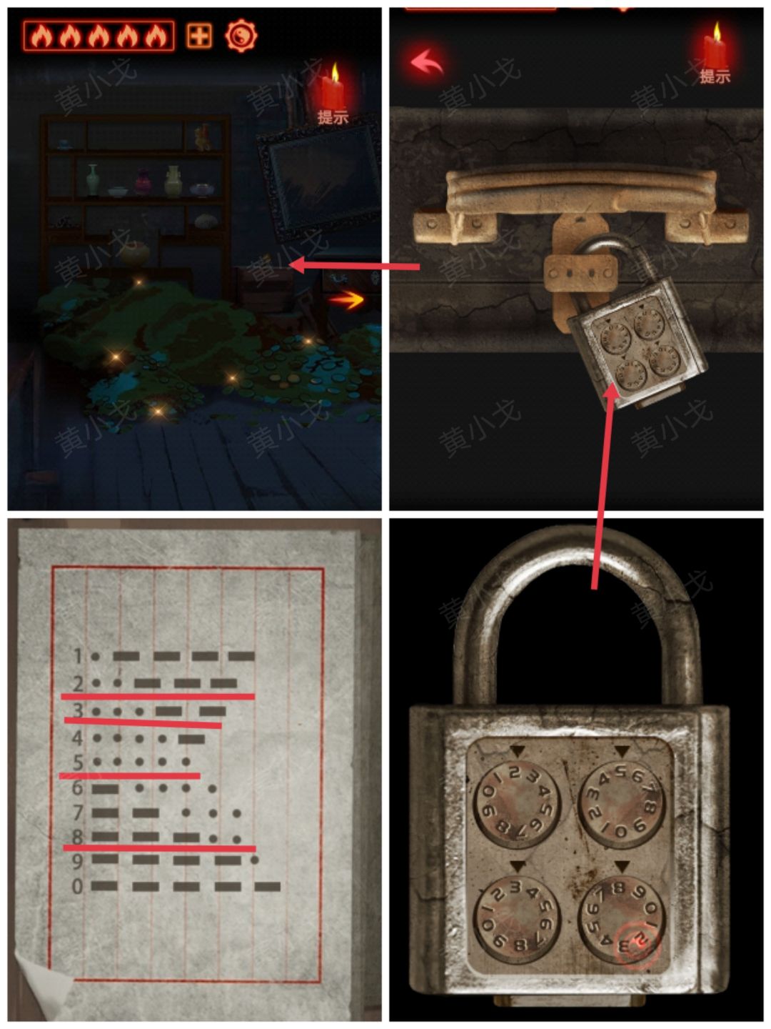 20.(钱府-密室)点击箱子上的锁,根据电报机接收的电报(短短长长长 短短短短短 短短短长长 长长长短短),对照卷宗里的摩斯电码表,得到密码:2538,输入密码