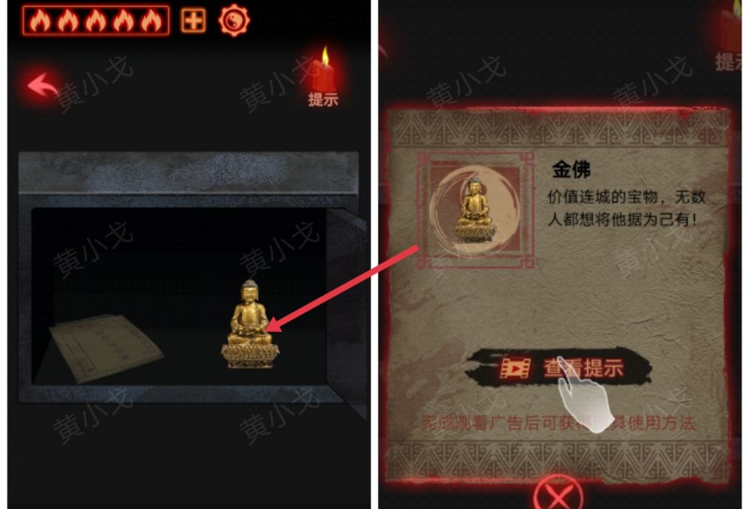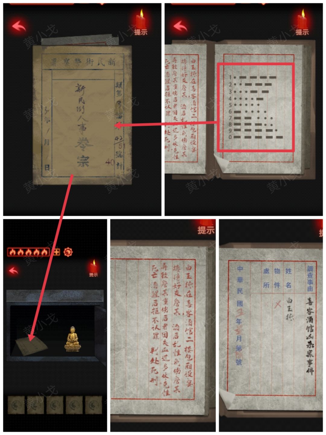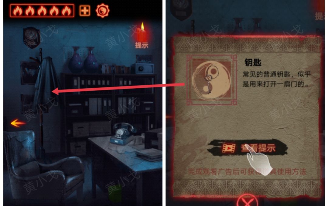 8.(钱府-暗门)点击瓶子底部机关,根据喷泉上的线索,按顺序和次数点击按钮(顺时针2,逆时针1,顺时针3,逆时针2)。打开暗门,进入密室