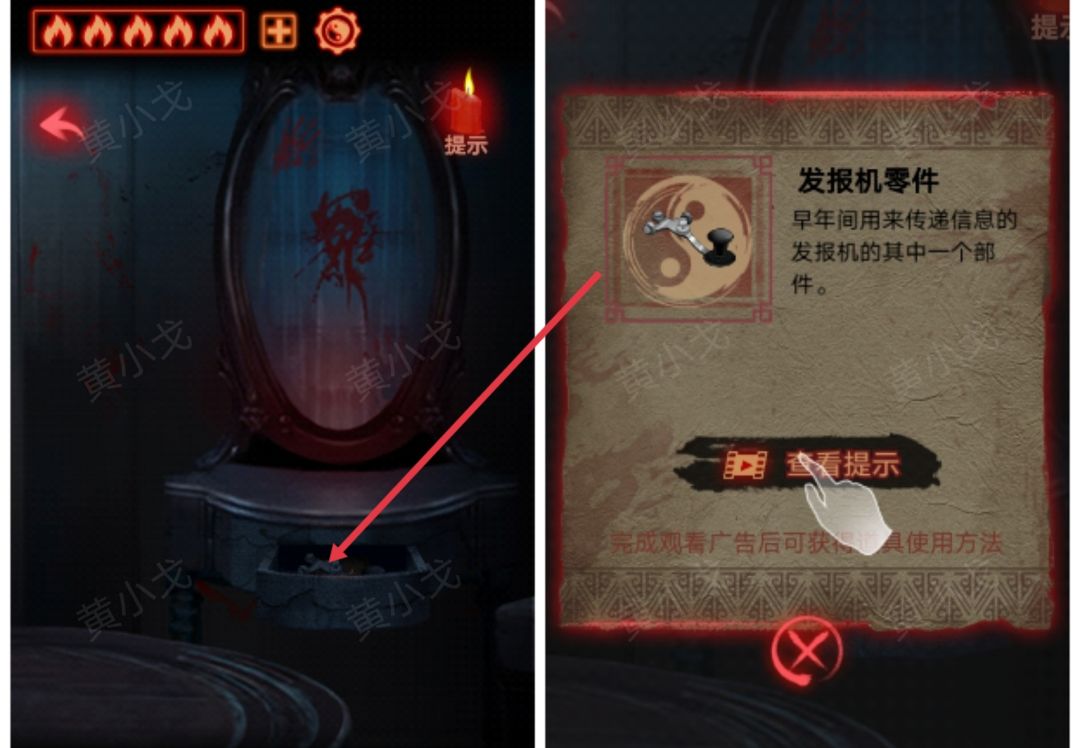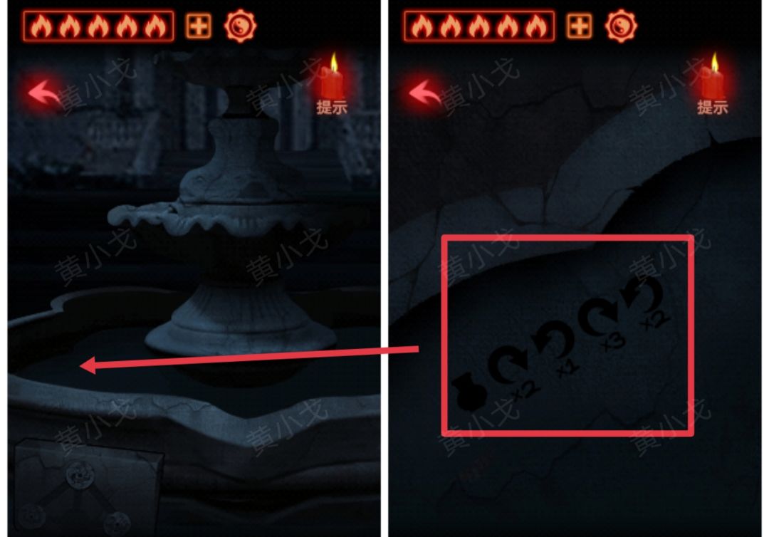 7.关闭喷泉,获得线索(瓶子图案:顺时针2,逆时针1,顺时针3,逆时针2)