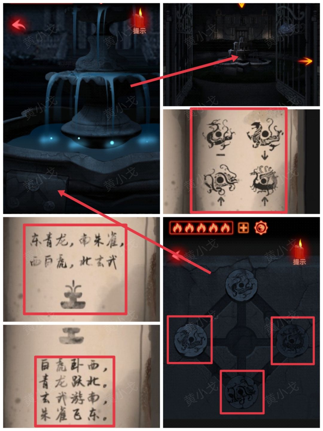 6.(大门)点击喷泉,根据书上的线索,调整四神兽滑块的位置(