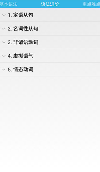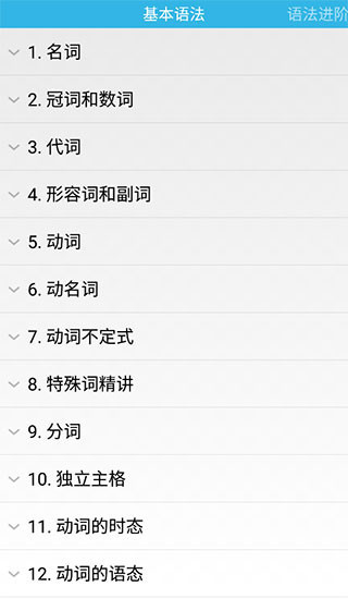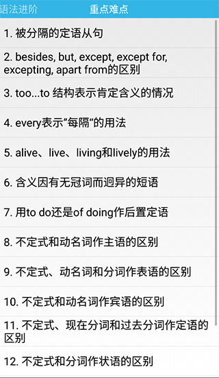 Grammar下载是专注于英语语法学习的实用工具,内容覆盖基础到进阶的各类语法考点,适合学生及英语爱好者使用。软件内语法分类清晰,支持左右滑动切换章节,学习体验流畅。重点讲解如时态用法(一般现在时、过去时、完成时等),配有详细解析与实例,帮助用户深入理解、巩固记忆。所有内容均以文字形式展示,清晰直观,还可收藏重点章节,便于复习。Grammar安卓版免费结合在线课程与答疑功能,让语法学习更加高效灵活,是提升英语基础的好帮手。