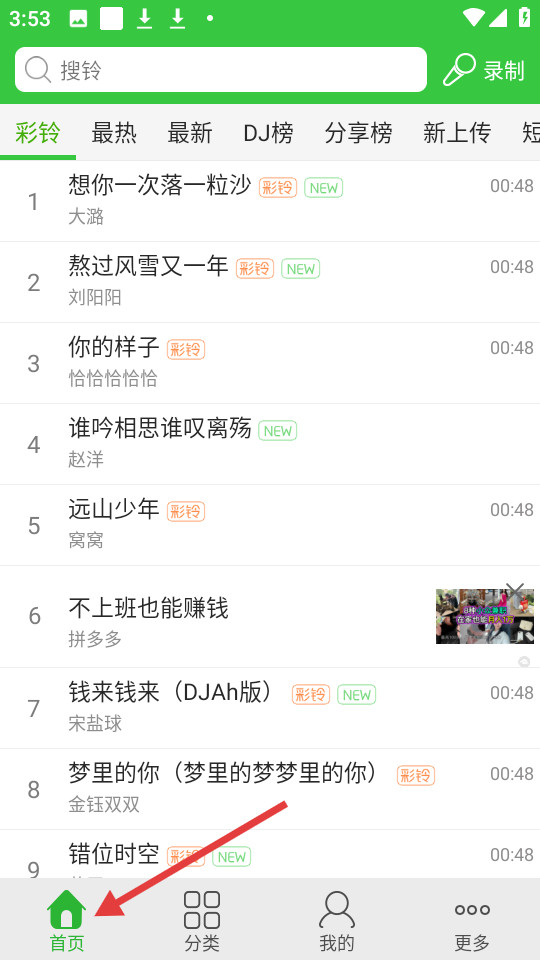 1、首页顶部支持搜铃与录制,呈现彩铃榜单想你一次落一粒沙等歌曲在列,标注新曲标识展现热门铃声。