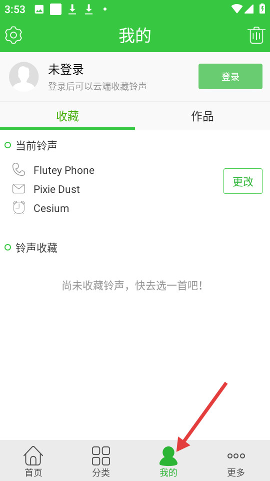 3、我的页面提示未登录,登录享云端收藏,展示当前电话、短信等铃声,支持更改鼓励用户收藏喜欢的铃声。
