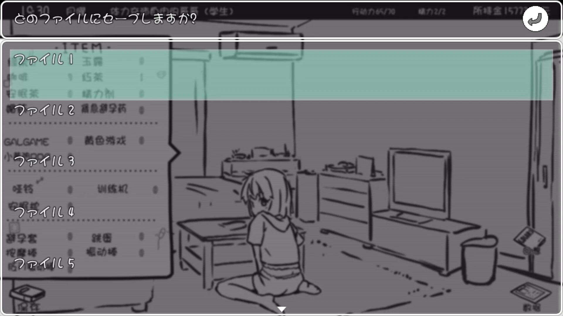 5、物品菜单分5个文件夹(ファイル1–5),含玉露、红茶、精力剂等道具,其中“黄色游戏”“训练机”等为特殊功能项,使用前需确认效果与风险。