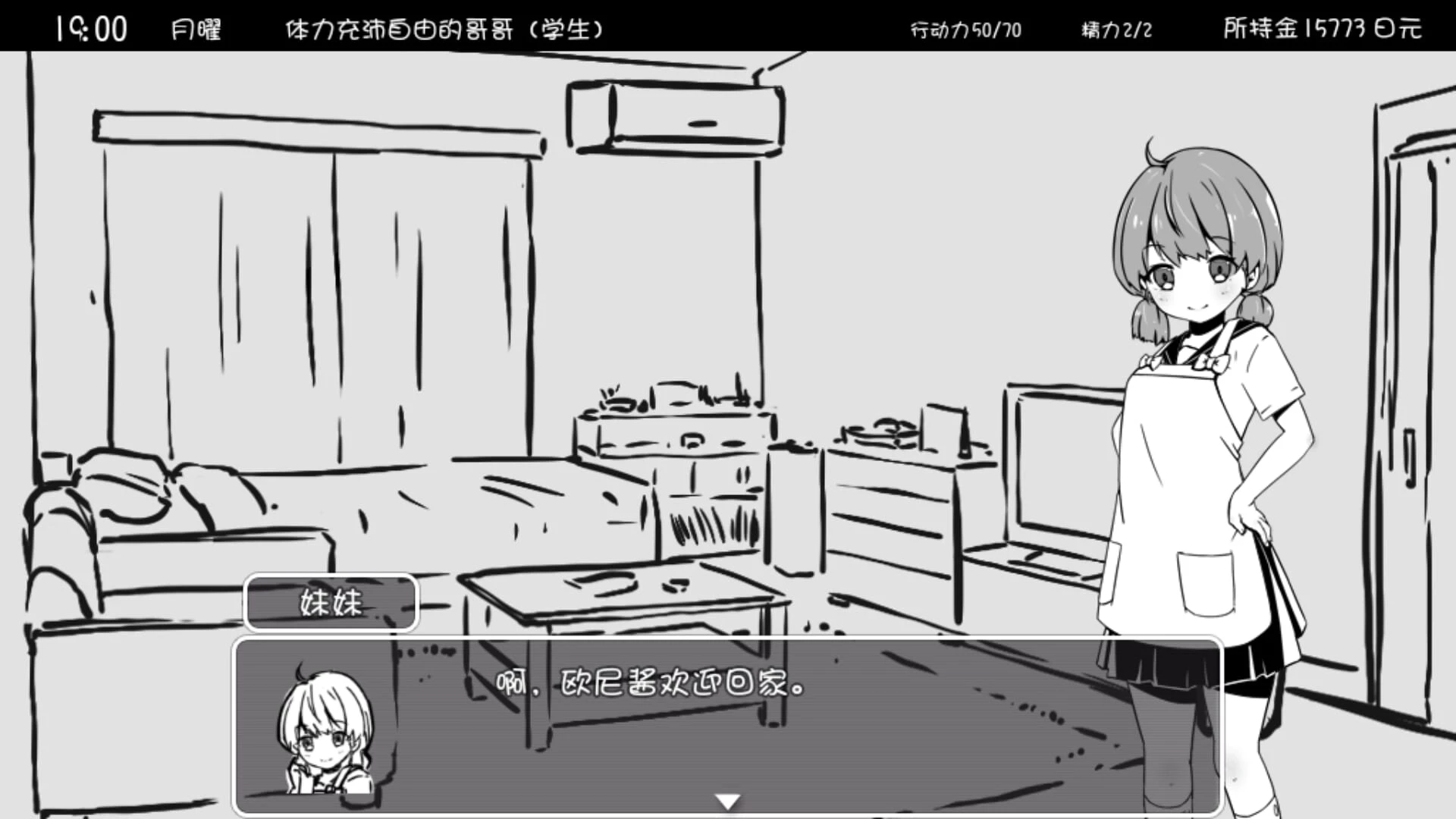 4、游戏内状态栏显示时间(19:00)、体力(50/70)、精力(2/2)与金钱(15773日元),需注意体力消耗影响行动力,及时休息恢复。